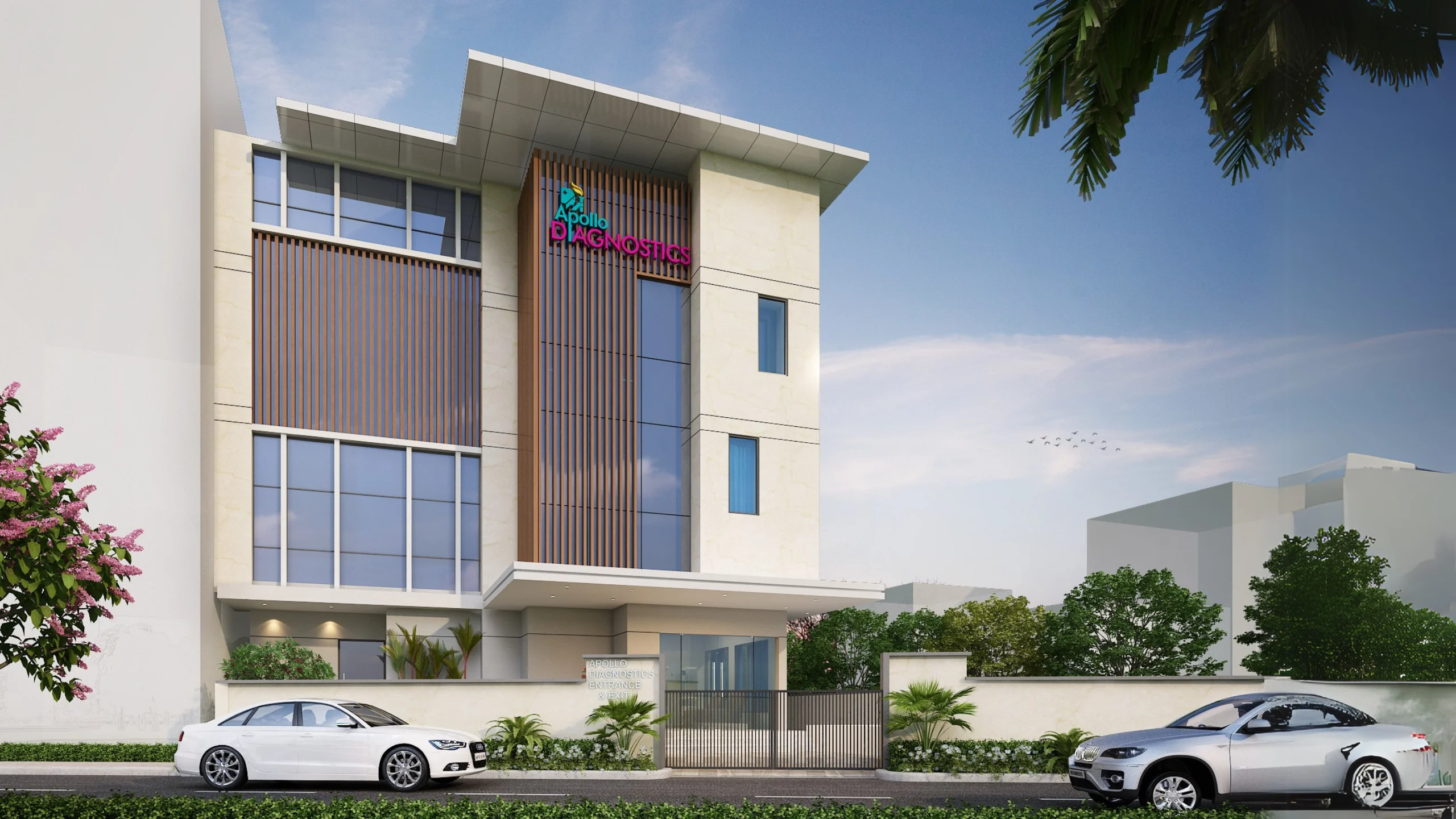 The Apollo Diagnostic Clinic in Agra represents a thoughtful convergence of healthcare functionality and architectural clarity. The clinic is envisioned as a modern, patient-centric facility that prioritizes comfort, efficiency, and trust. The architectural language is clean and contemporary, with a focus on natural light and intuitive circulation. The façade features a restrained palette of materials—glass, stone, and metal—chosen for their durability and hygienic properties, while also projecting a sense of calm professionalism.